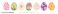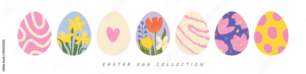 • A collection of decorative painted Easter eggs in a trendy flat style featuring hearts, spring flowers, and geometric patterns. Vector elements for holiday design.