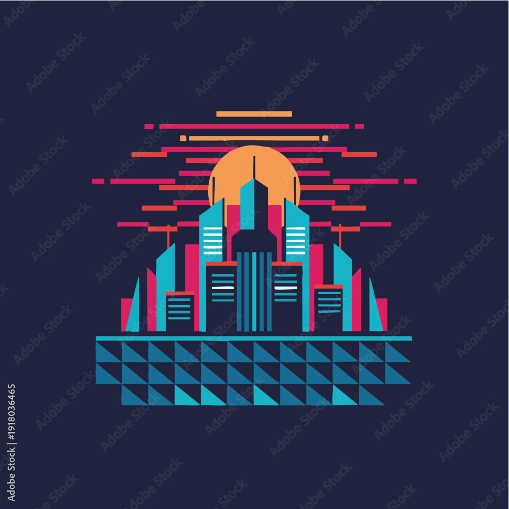 Geometria - Futuristic cityscape in neon lights with vibrant colors on geometric background for technology... #1918036465