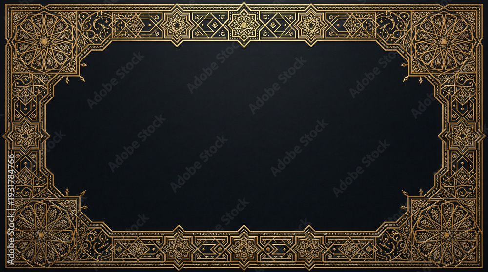 Geometria - Intricate Golden Islamic Star Pattern Border on Dark Background for Ramadan #1931784766
