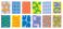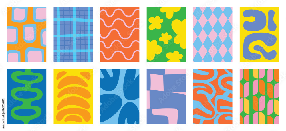 • Colorful abstract geometric pattern vector set with green pink blue orange and cream shapes. Modern playful retro design for wallpaper, textile, packaging, poster and background.
