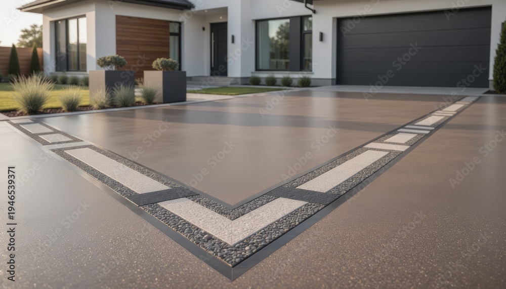 • Modern House Driveway with Decorative Concrete Pattern and Landscaping.