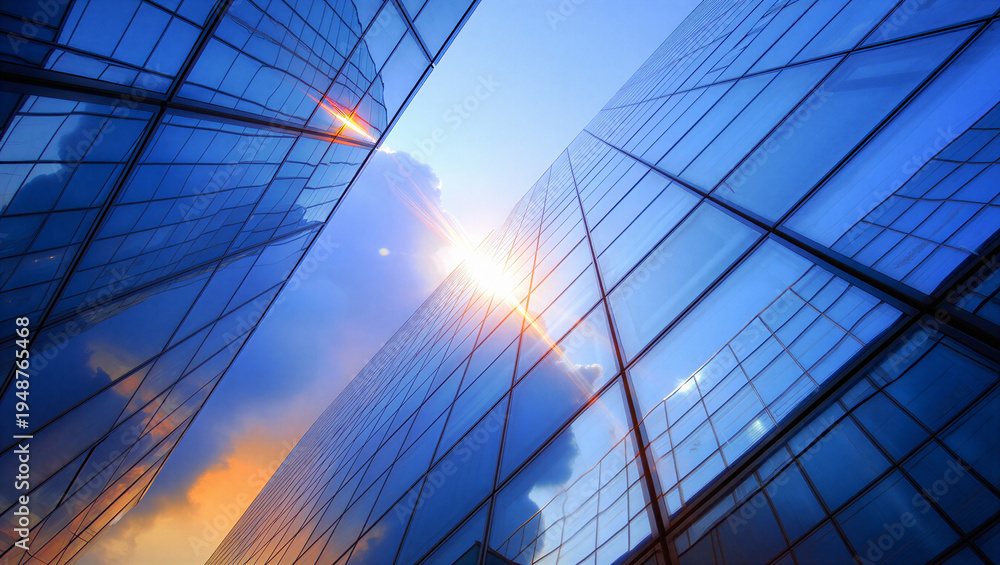 Geometria - Reflective Blue Glass Skyscrapers with Bright Sun and Clouds Between Them #1948765468