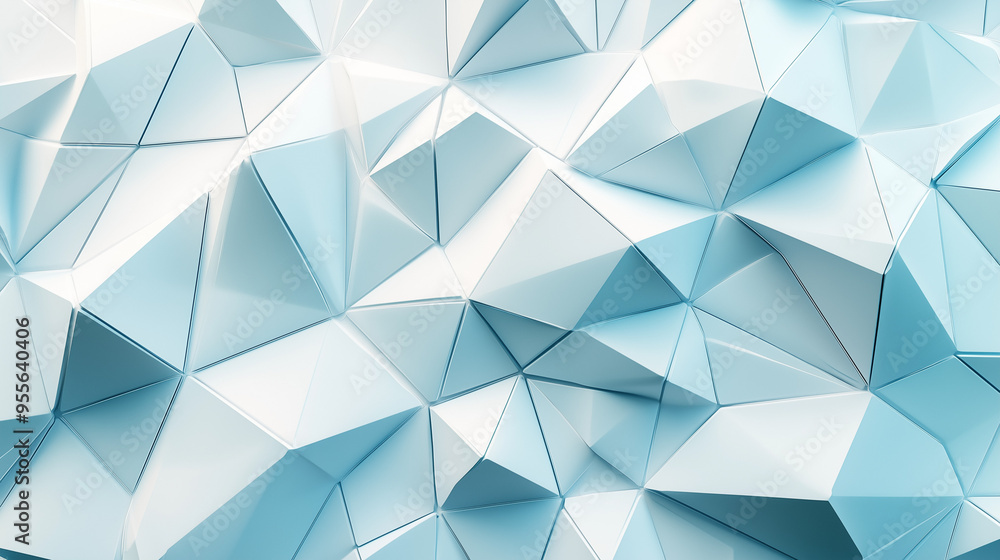 Geometria - Złożona, teksturowana ściana 3D w jasnoniebieskich i białych odcieniach, idealna jako tło do... #955640406