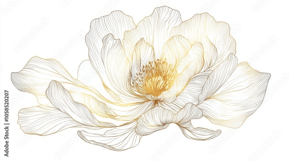 • 36.A luxurious golden peony flower rendered in delicate line art, set against a white background. The thin, elegant lines of the flower’s petals are accentuated with a gold foil texture, creating a