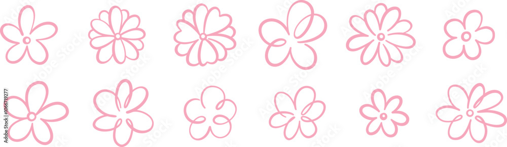 • Cute pink flower line art shapes, ink doodle illustration set, flat clip art decorative spring collection, isolated