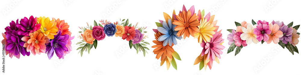 • Fairy and myth sparkle, A vibrant display of floral crowns showcasing various colorful flowers arranged in artistic designs.