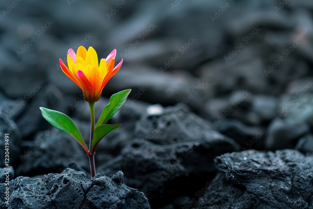 • A vibrant orange and pink flower blooms amidst dark volcanic rocks, symbolizing resilience and beauty in harsh environments. Life Amidst Cold Volcanic Rock, Lonely Bloom