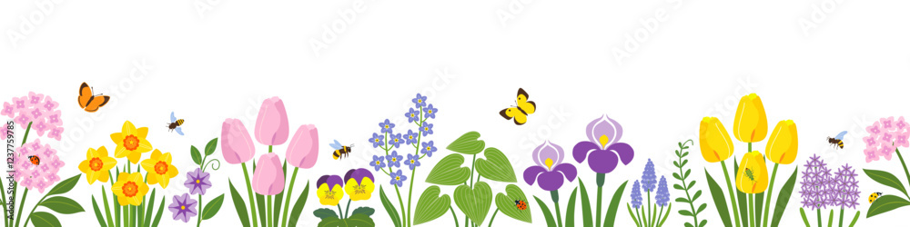 • Vector seamless border of colorful spring garden flowers with insect pollinators on white background.
