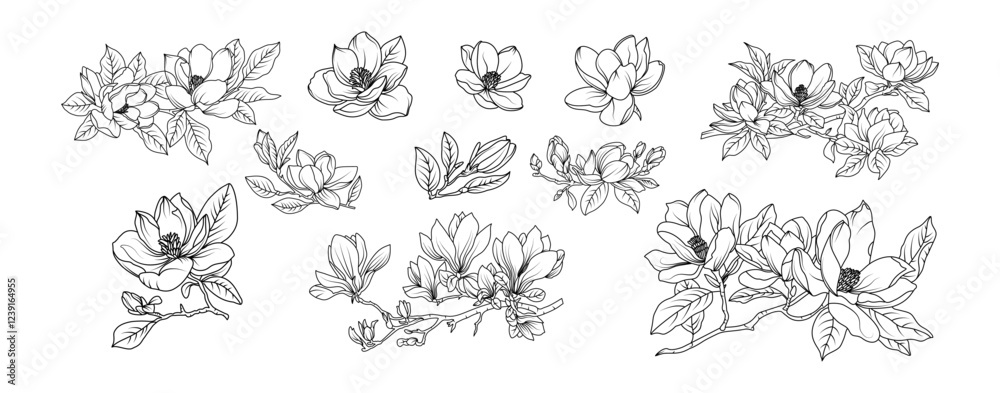 Kwiaty i rośliny - Magnolia flower arrangement line art on white background. Silhouette magnolia botanical hand... #1239164955