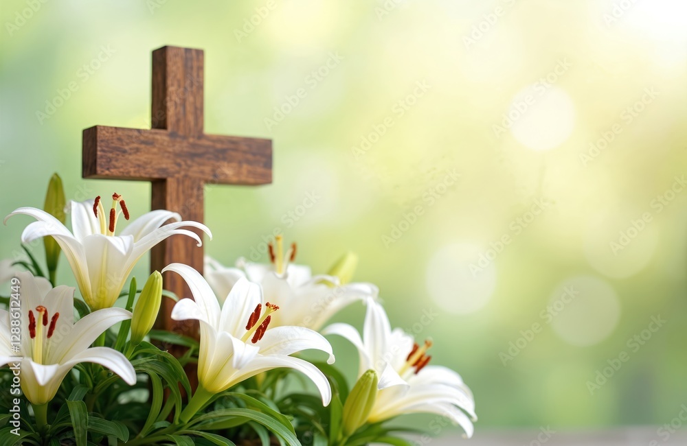 • Wooden cross, easter lilies on green blurred background. Christian holiday floral composition with religious symbol of faith, hope, love. Springtime celebration, resurrection of Jesus Christ.