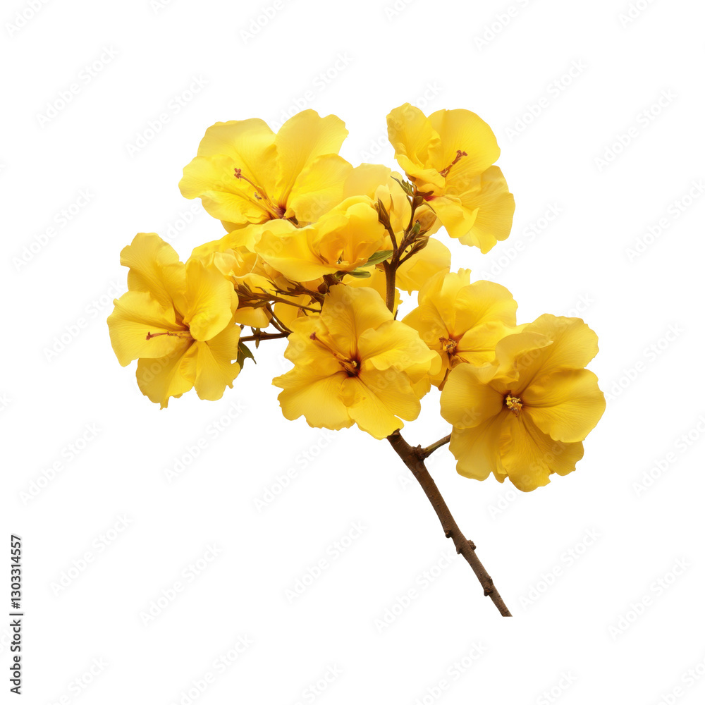 • Vibrant yellow Tabebuia flowers bloom beautifully on a slender branch, highlighting their striking color against a transparent background.