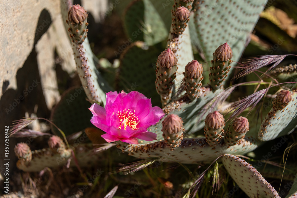 Kwiaty i rośliny - Purple Beavertail pricklypear (Opuntia basilaris Engelm) cacti in bloom in Sonoran Desert #1357758942
