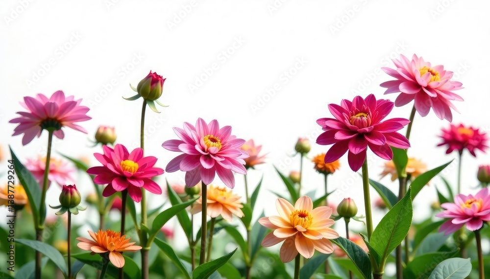 • stunning dahlia flowers blooming in a garden against a white background, white, bloom