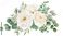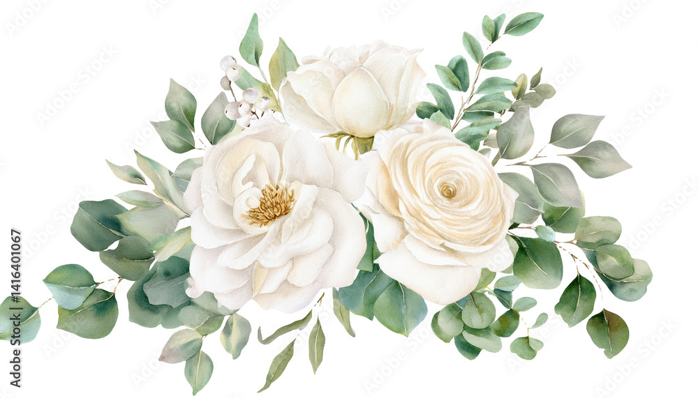 • White flowers and green eucalyptus leaves watercolor illustration isolated on transparent background. Creamy roses bouquets, wedding florals