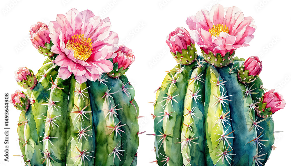 Kwiaty i rośliny - a delicate watercolor painting depicts two blooming saguaro cacti with vibrant pink flowers and... #1493644908