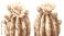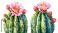 • a delicate watercolor painting depicts two blooming saguaro cacti with vibrant pink flowers and detailed spines against a white background.
