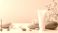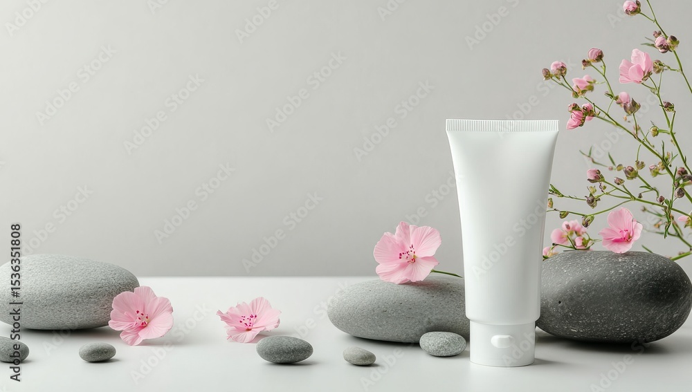 • Photo of a white tube mockup with pink flowers and gray stones on a light gray background, in a flat lay. Space for text. On the right side is an empty space to add your own product or service details