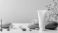 Kwiaty i rośliny - Photo of a white tube mockup with pink flowers and gray stones on a light gray background, in a... #1536351808