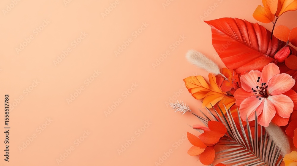 Kwiaty i rośliny - Coral paper flowers and leaves arrangement #1556517780