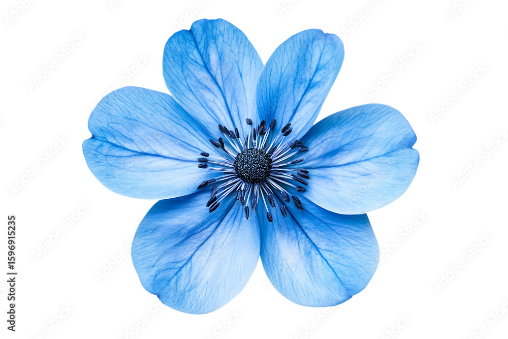 • Close-up of a vibrant blue anemone flower with delicate petals, isolated on a white background, embodying the beauty of nature in bloom