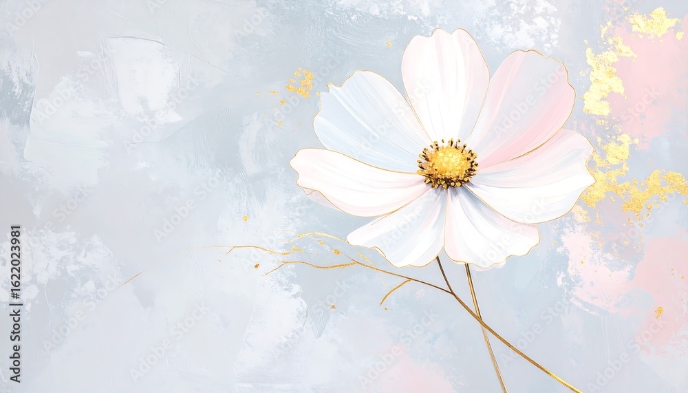 • A single, large white and pink flower with gold accents on a textured, light blue background