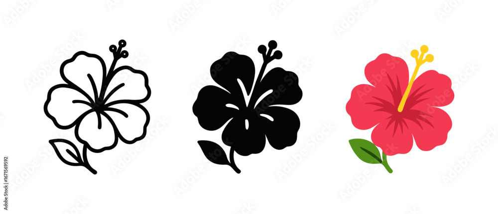 • Elegant hibiscus flower variations in outline, solid, and vibrant color