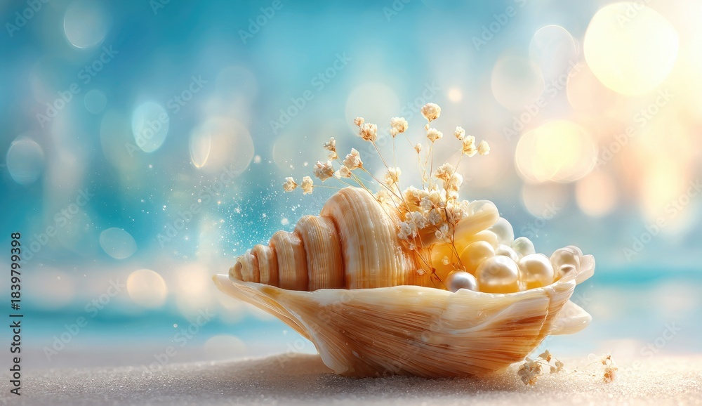 Kwiaty i rośliny - Seashell with pearls and flowers rests on sand. #1839799398