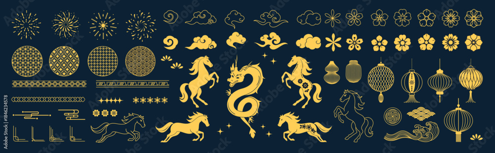 • Chinese New Year decorative elements vector set with golden horse dragon lantern cloud flower and geometric ornaments. Elegant oriental design for greeting cards invitations packaging banners and ads.