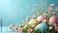 • Easter eggs in pastel colors nestled among small pink and white flowers on a soft blue background. Springtime holiday symbols are arranged with delicate blossoms, creating a festive and joyful scene.