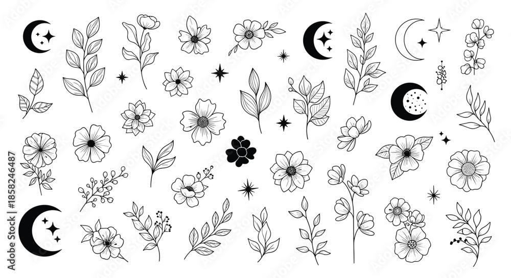 • A large celestial and botanical collection of hand-drawn doodle elements featuring flowers leaves moons and stars for magical designs.