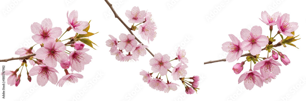 • Beautiful pink cherry blossom branches set isolated on white background