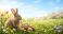 Kwiaty i rośliny - Cute brown easter bunny sitting on green grass near basket full of colorful painted eggs #1945699111