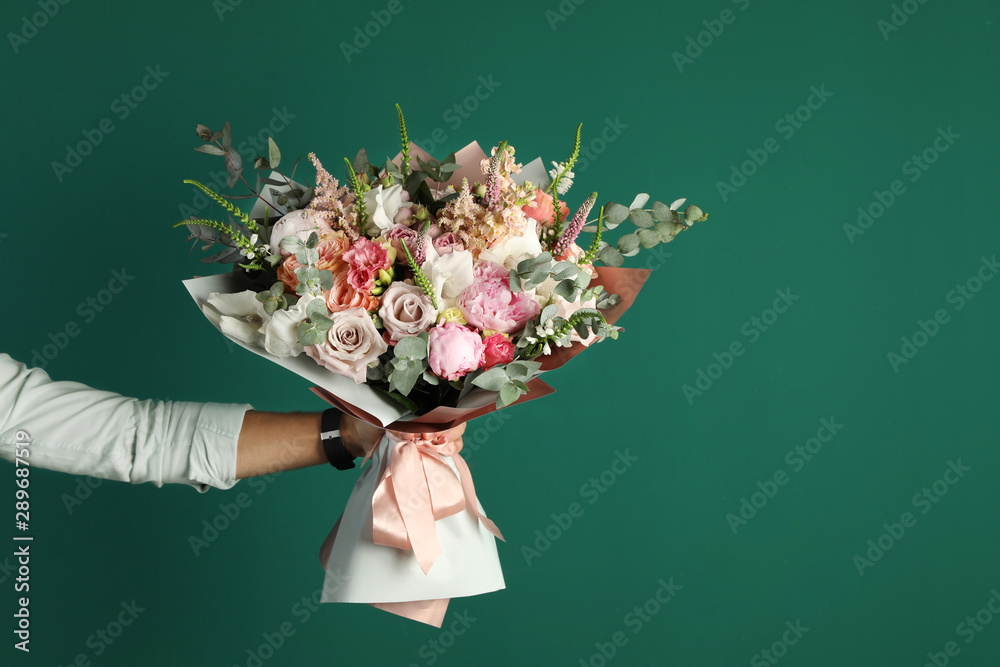Kwiaty i rośliny - Man holding beautiful flower bouquet on green background, closeup view. Space for text #289687519