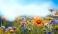 • Colorful flower meadow with sunbeams and blue sky and bokeh lights in summer - nature background banner with copy space - summer greeting card wildflowers spring concept