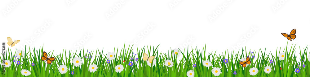 Kwiaty i rośliny - Lush grass with flowers and butterflies background #610782958