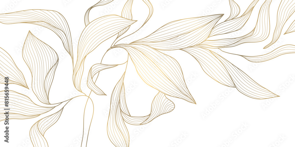 • Vector golden flower background, luxury abstract line leaves composition. Art deco floral ornament, elegant summer print. Foliage drawing, vintage illustration