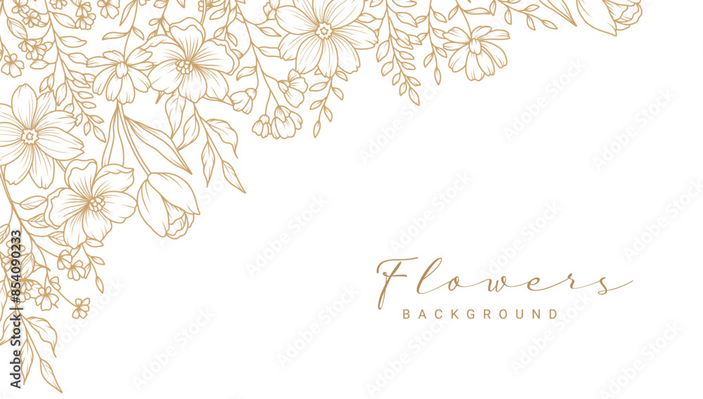 • Golden flower frame. Corner. Luxury pattern with a bouquet of flowers, branches, leaves. Vector illustration with drawn elegant vintage botanical decorative elements