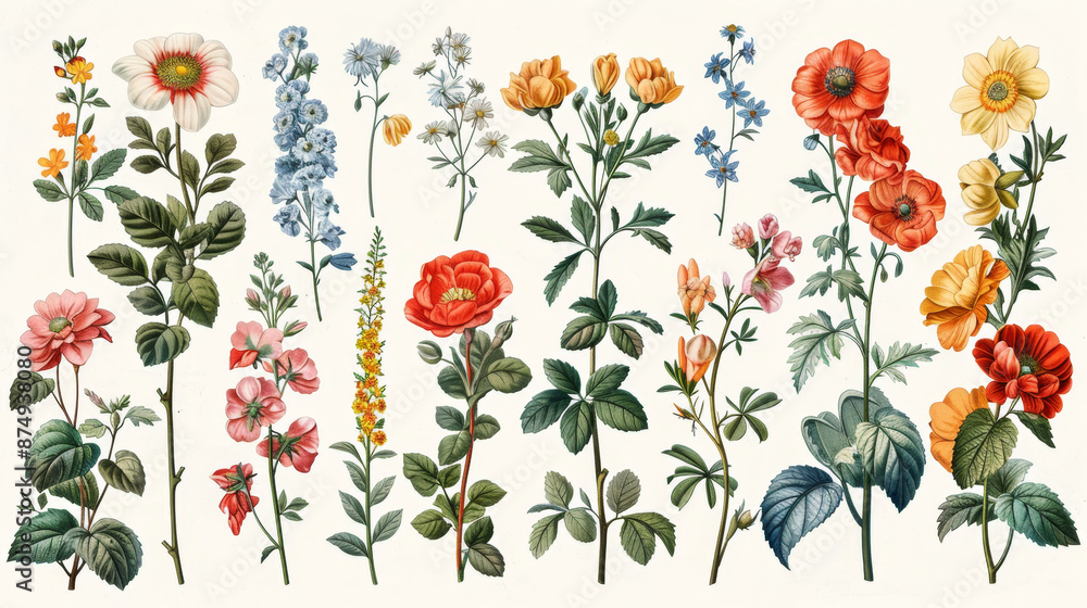 Kwiaty i rośliny - Intricate vintage botanical illustration of various flowers on a white background. #874938080