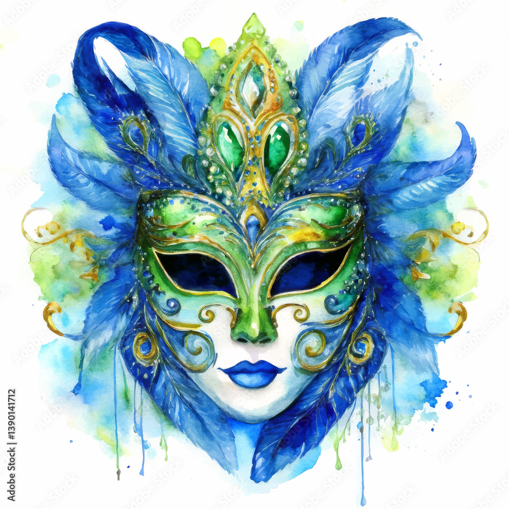 Wenecja - Wenecka maska karnawałowa akwarela niebiesko-zielona z piórami #1390141712