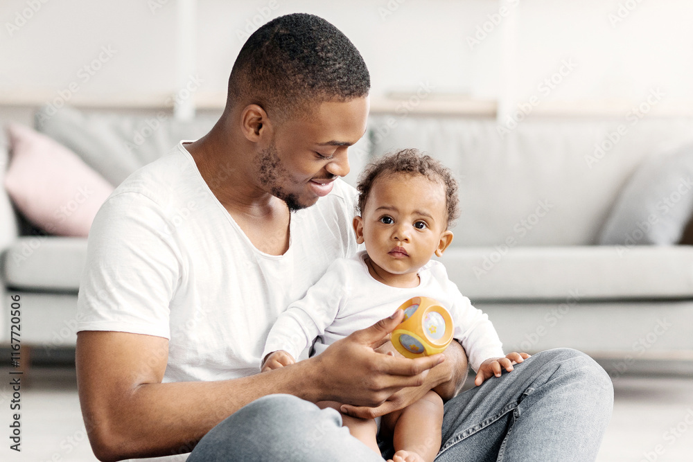 • Happy Young Black Father Playing With His Cute Infant Baby Son At Home, Loving African American Dad Enjoying Fatherhood, Spending Time Together With Adorable Toddler Child In Living Room, Free Space