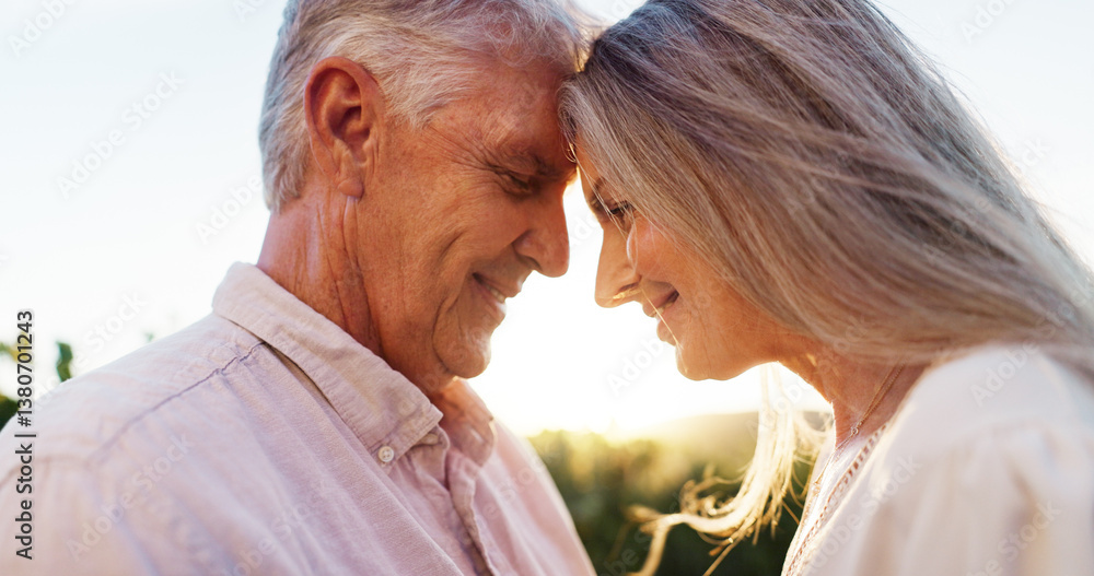 • Senior couple, care and forehead touch for love, strong connection and healthy relationship. Romance, happy man and woman outdoor for bonding together, loyalty or commitment to marriage in retirement