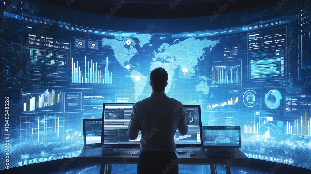 Fototapeta do Biura - W biurze pełnym nowoczesnych technologii, biznesmen analizuje dane na pulpicie swojego komputera,... #1040348226