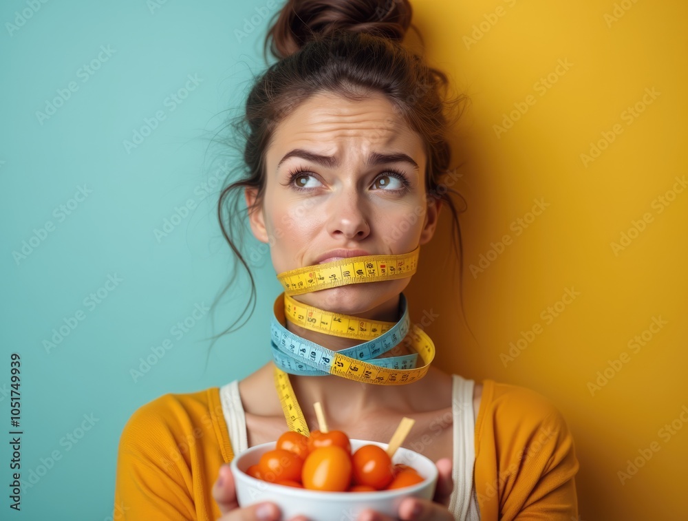 Fototapeta do Restauracji - An Emotional Woman with Measuring Tapes Around Her Mouth, Facing the Challenge of Unhealthy Food... #1051749939