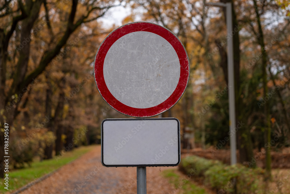 Fototapeta Pojazdy - Znak zakazu wjazdu na drodze w parku jesienią – symbol ograniczenia i przepisów ruchu drogowego #1788250587
