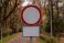Znak zakazu wjazdu na drodze w parku jesienią – symbol ograniczenia i przepisów ruchu drogowego