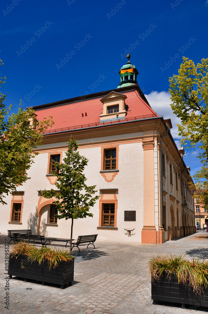 • Zabytkowy ratusz z wieżą zegarową na słonecznym jesiennym rynku w Polsce - Wielkopolska Rawicz.