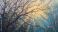 • Malowidło ukazujące drzewo z żółtymi liśćmi, oświetlone promieniami słońca przebijającymi się przez gałęzie