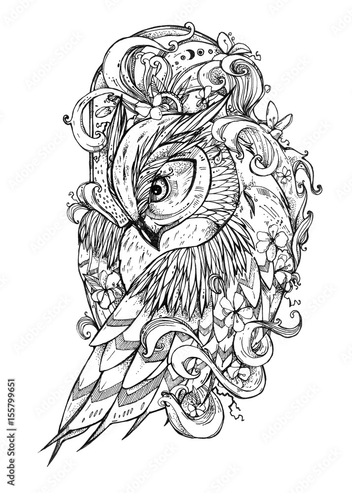 • Piękna ilustracja z sową. Sowa wewnątrz oceanu z kwiatami sakury. Może służyć do nadruku na koszulkach i pomysłu na tatuaż.