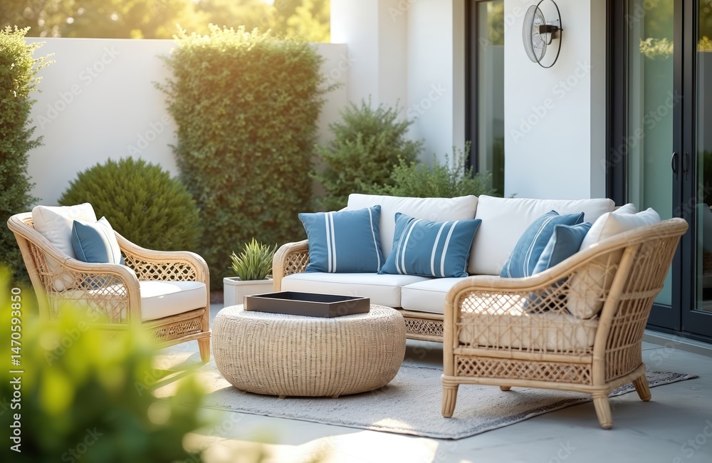 • Rattan chairs and sofa with blue pillows on home patio. Outdoor furniture near house with plants, sky. Luxury leisure, vacation vibes. Cozy terrace relaxation, modern design.