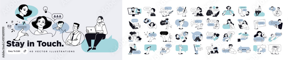 • People vector illustrations in various activities of communication, social media, networking, support, community, chatting, app and services, rating and review, conversation.